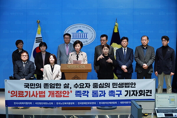 에이블뉴스 이슬기 기자】더불어민주당 남인순 의원과 국민의힘 최보윤 의원이 21일 국회 소통관에서 노인·장애인·환자·사회복지·의료기사 단체 대표들과 기자회견을 갖고 , 통합돌봄 대상자인 장애인과 노인의 존엄한 삶을 보장하고 통합돌봄을 제대로 실현하기 위한 수요자 중심 민생법안인 '의료기사법 개정안' 국회 통과를 강력히 촉구했다.