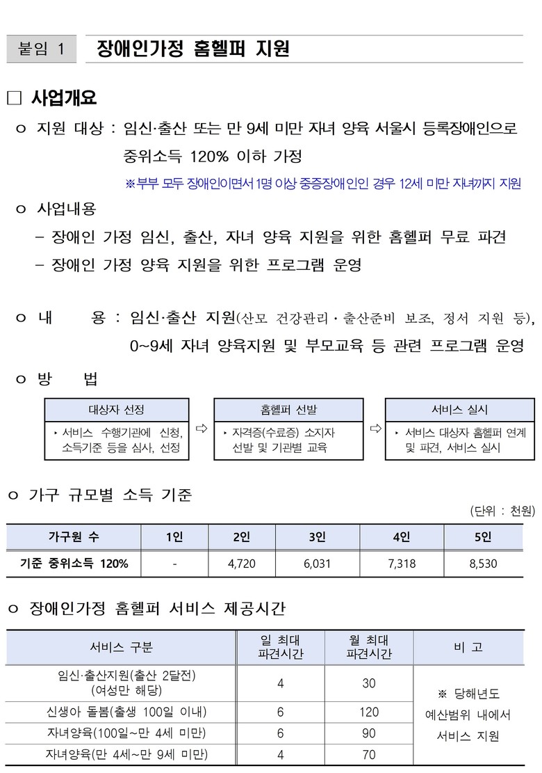 홈헬퍼 서비스는 임신·출산 또는 만 9세 미만 자녀를 양육하고 있는 서울시 등록 장애인 가정 중 중위소득 120% 이하의 가정에 무료로 제공되며, 이용 신청 등은 서비스 수행기관으로 문의하면 된다.