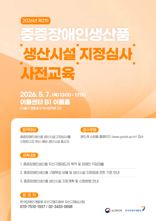 【에이블뉴스 이슬기 기자】한국장애인개발원이 오는 5월 7일 서울 여의도 이룸센터 이룸홀에서 중증장애인생산품 생산시설 종사자를 대상으로 ‘2026년 제2차 중증장애인생산품 생산시설 지정심사 사전교육’을 실시한다.