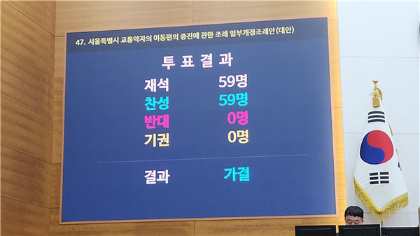 【에이블뉴스 이슬기 기자】서울특별시의회 문성호 의원(국민의힘)이 발의한 ‘서울특별시 교통약자의 이동편의 증진에 관한 조례 일부개정조례안’이 지난 28일 열린 제333회 임시회 본회의에서 재석 의원 59명 전원 만장일치로 가결됐다.