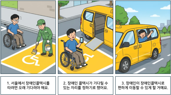 1 서울에서 장애인콜택시를 타려면 오래 기다려야 해요. 2 장애인 콜택시가 기다릴 수 있는 자리를 정하기로 했어요. 3 장애인이 장애인콜택시로 편하게 이동할 수 있게할 거예요. ©AI 편집실