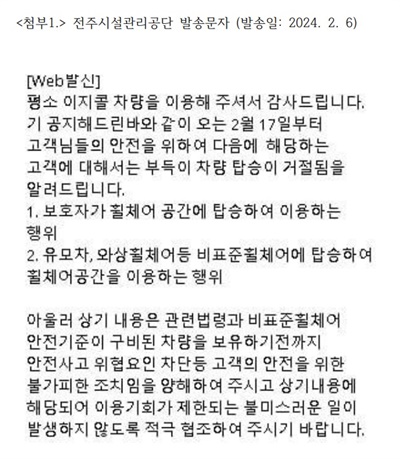 최근 전주시 장애인콜택시를 위탁운영하고 있는 전주시 시설관리공단에서 오는 17일부터 와상장애인들의 장애인콜택시 승차를 거절하겠다는 문자 공지를 보냈다.