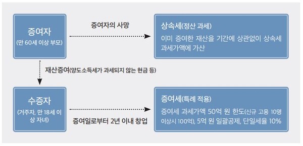 창업자금 증여세 과세특례란=창업자금 증여세 과세특례 요건과 특징을 간략하게 설명드리면 ① 국내 거주자인 만 18세 이상의 자녀가 ② 세법상 업종 요건에 부합하는 중소기업(개인사업, 법인 모두 가능)을 창업할 목적으로 ③ 만 60세 이상의 부모로부터 ④ 양도소득세가 과세되지 않는 재산을 증여받고, ⑤ 증여받은 창업자금 중 증여세 과세가액 50억 원(10명 이상 신규 고용 시 100억 원 한도)을 한도로 ⑤ 증여세 과세가액에서 5억 원을 공제하고 ⑥ 단일 특례세율 10% 로 하여 증여세를 부과하는 제도를 말합니다.