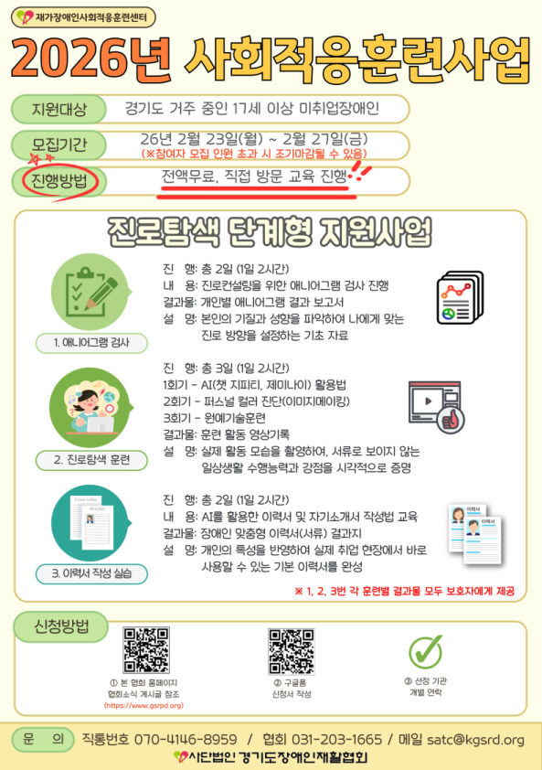 재가장애인사회적응훈련센터는 1995년부터 경기도 내 최초로 장애인 대상 맞춤형 교육을 운영해 온 기관으로, 올해로 30년째 사업을 이어오고 있다. 이번 사업은 장애인복지법 제2장 제19조에 근거해 도내 장애인의 원활한 사회·일상 복귀를 지원하기 위해 추진된다.