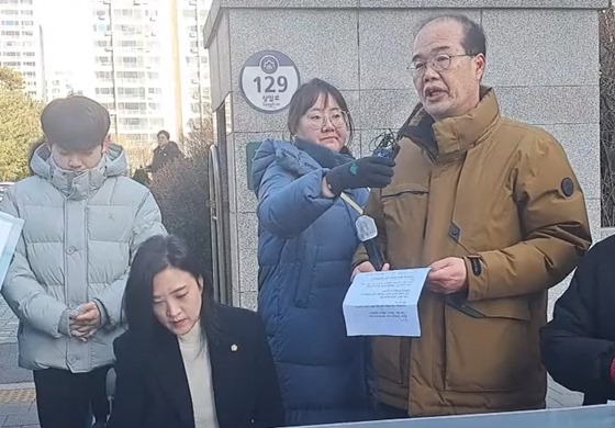 12일 오전 10시 30분 인천지방법원 부천지원 앞에서 개최된 발달장애인 김동호 씨의 수술 후 사망 사건 손해배상청구소송 1차 변론기일 기자회견에서 발언하는 고인 김동호 씨의 아버지. ⓒ장애인차별금지추진연대