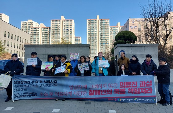 장애인차별금지추진연대(이하 장추련)와 피플퍼스트서울센터는 12일 오전 10시 30분 인천지방법원 부천지원 앞에서 발달장애인 김동호 씨의 수술 후 사망 사건 손해배상청구소송 1차 변론기일을 약 30분 앞두고 기자회견을 개최했다.