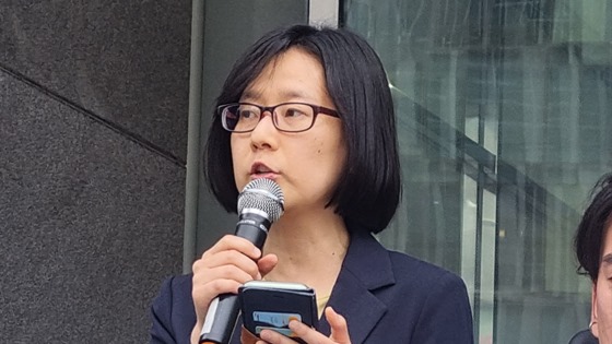 25일 오전 10시 인권위 앞에서 개최된 ‘오세훈 서울시장, 버스회사에 전장연 저상버스 탑승 거부 지시에 대한 국가인권위원회 진정 기자회견’에서 발언하는 희망을 만드는 법 최현정 변호사.