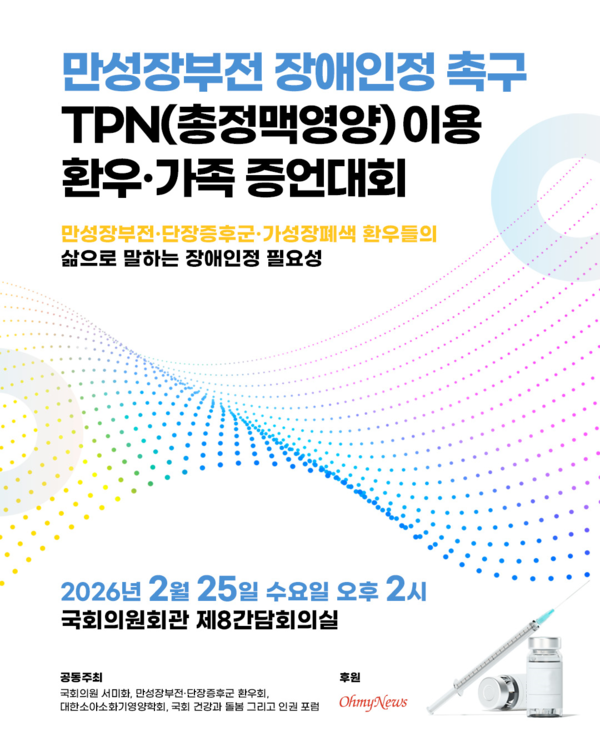 증언대회는 서미화 의원과 만성장부전·단장증후군 환우회, 대한소아소화기영양학회, 국회 건강과 돌봄 그리고 인권 포럼이 공동주최한다.