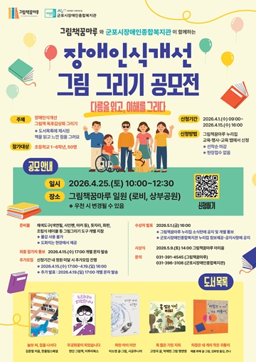 【에이블뉴스 백민 기자】 군포시장애인종합복지관(이하 군포장복)은 오는 4월 1일부터 15일까지 군포 그림책꿈마루와 공동으로 개최하는 초등학생을 대상 장애인식개선 그림그리기 공모전 ‘다름을 읽고, 이해를 그리다’ 참여자를 모집한다.