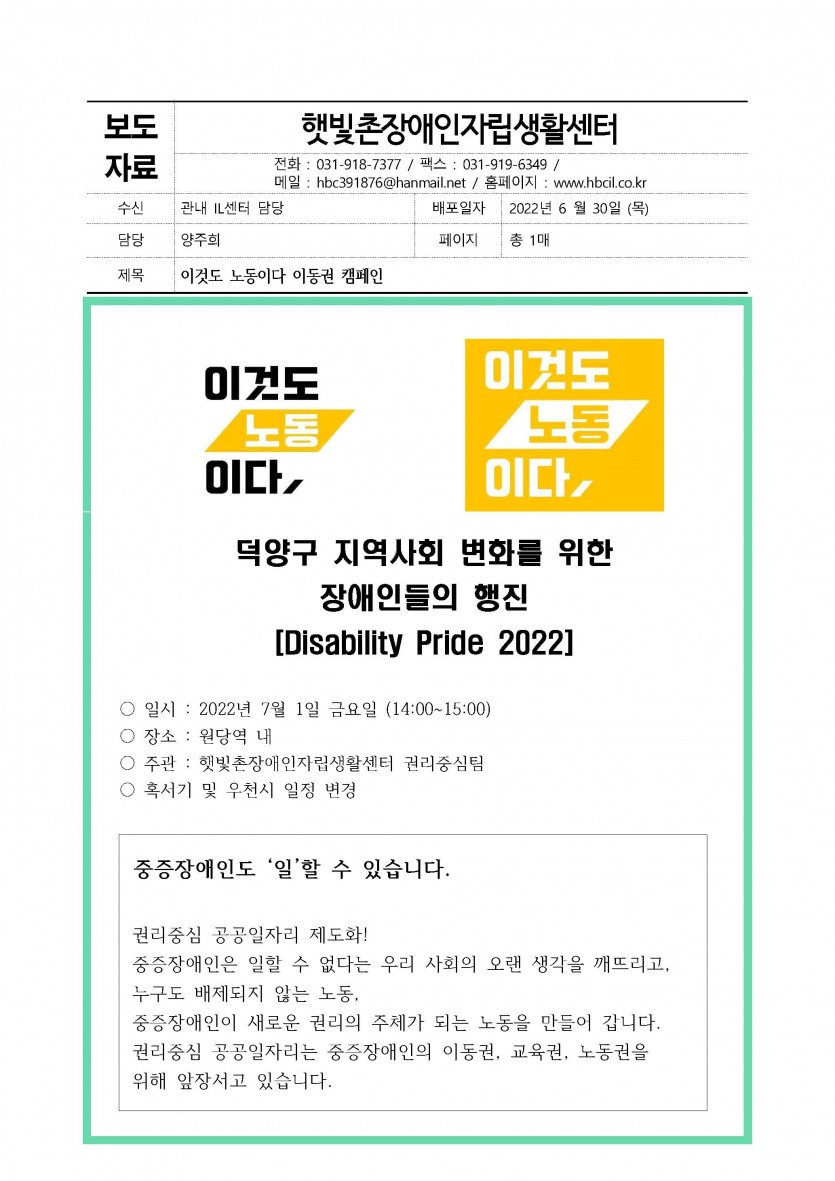 7월1일 금요일 원당역 내에서 덕양구 지역사회 변화를 위한 장애인들의 행진[Disability Pride 2022]를 진행합니다.