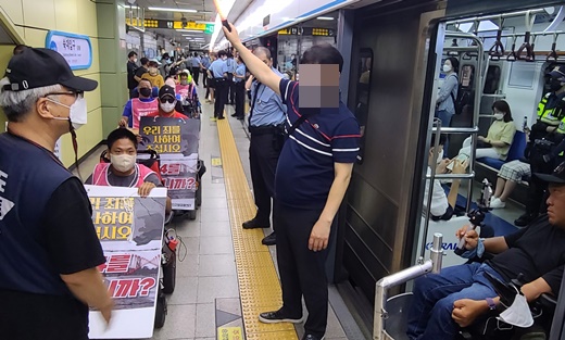“우릴 가두지 마십시오. 우릴 죽이지 마십시오.” 구슬픈 가락의 T4 노래를, 전장연 박경석 상임공동대표가 한 곡절 뽑습니다. ‘T4’는 노들장애인야학의 권리 중심 중증장애인 맞춤형 공공일자리 노동자들이 작곡한 것으로, 박 상임공동대표가 직접 노랫말을 붙였습니다. ‘T4 우리 죄를 사하여 주옵소서’가 쓰인 파란 부채도 함께 흔들어봅니다. 50분이 다 돼서야 휠체어를 탄 중증장애인 활동가들이 엘리베이터를 타고 승강장으로 모두 내려왔습니다.