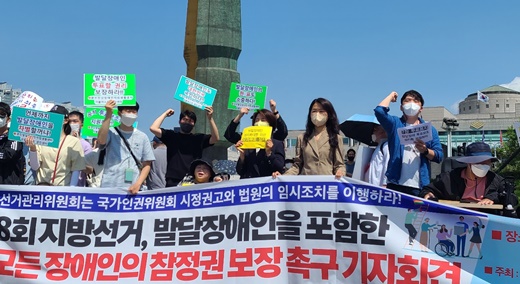 장애인차별금지추진연대 등이 27일 사전투표에 앞서 윤석열 대통령 집무실 건너편 전쟁기념관 앞에서 “참정권을 보장해달라”며 기자회견을 개최했다.ⓒ에이블뉴스 에이블포토로 보기▲ 장애인차별금지추진연대 등이 27일 사전투표에 앞서 윤석열 대통령 집무실 건너편 전쟁기념관 앞에서 “참정권을 보장해달라”며 기자회견을 개최했다.ⓒ에이블뉴스