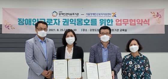 서울장애인근로자지원센터(센터장 황보익, 이하 근로자지원센터)가 25일 강원도장애인권익옹호기관(관장 안계선, 이하 강원옹호기관)과 장애인 근로자 권익 옹호를 위한 업무협약을 체결했다.