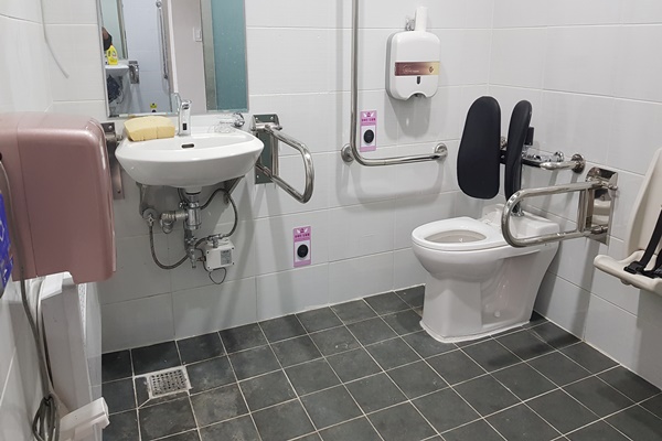 1층 남녀장애인화장실은 별도로 마련돼 있어 성별이 다른 활동보조인의 도움을 받을 수 있고, 출입문도 손이 불편하거나 휠체어를 사용하는 장애인이 이용하기 편한 터치식자동문이다. 또한 남녀비장애인화장실 없어 시각장애인이 남녀장애인화장실을 이용할 수 있기 때문에 입구 벽면에 손끝으로 만져 성별을 알 수 있는 점자표지판, 앞바닥에 점자블록이 양호하게 설치됐다.