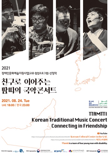 장애인 사물놀이 땀띠가 오는 24일 오후 11시 한-UAE 상호문화교류의 해와 2020 도쿄패럴림픽을 축하하며, 유튜브를 통해 ‘친구로 이어지는 땀띠의 국악콘서트’ 영상을 공개한다.