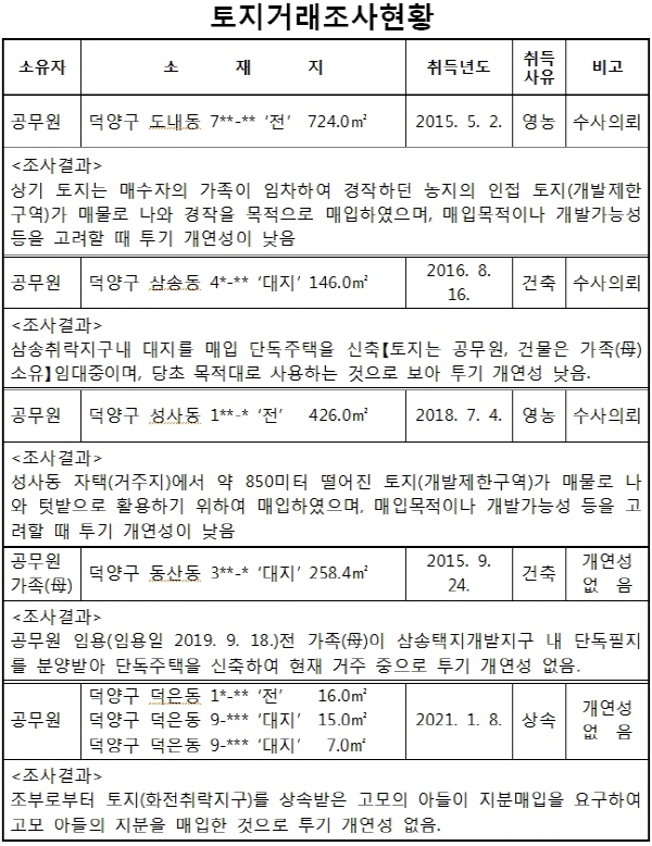 시는 조사과정에서 공직자와 일부 가족 등 모두 5명이 3기 신도시 지정지역에는 포함되지 않았지만, 인근 지역에 주택건축, 영농, 상속관련 등을 목적으로 토지를 매수한 사실을 확인하고 5명에 대하여 개별공시지가 변동내역 등을 추가적으로 조사한 결과, 2명은 상속지분 매입과 임용 전 가족 매입으로 부동산 투기 개연성이 없고 3명은 개연성이 매우 낮은 것으로 조사된다고 밝혔다.