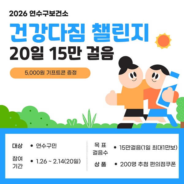 인천시 연수구보건소는 새해를 맞아 주민의 건강생활 실천을 지원하고 일상 속 걷기 습관 형성을 돕기 위해 ‘2026년 건강다짐 걷기 챌린지’를 운영한다.