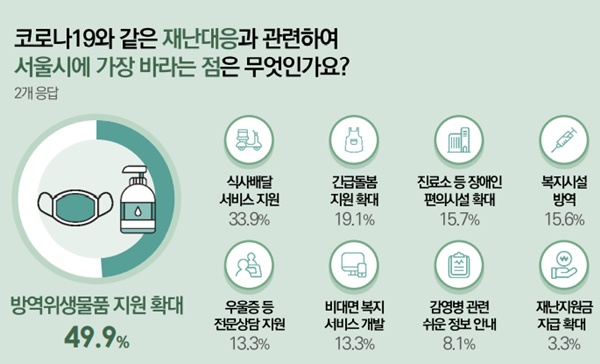코로나19와 같은 재난대응에 있어 서울시에 가장 크게 바라는 점.ⓒ서울시복지재단 에이블포토로 보기▲ 코로나19와 같은 재난대응에 있어 서울시에 가장 크게 바라는 점.ⓒ서울시복지재단중증장애인에게 코로나19와 같은 재난대응에 있어 서울시에 가장 크게 바라는 점에 대해 질문한 결과, 방역위생물품 지원 확대가 49.9%로 거의 절반을 차지했다.
