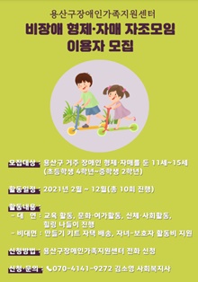 에이블포토로 보기▲ 2021년 비장애 형제·자매 자조모임 이용자 모집 포스터. ⓒ용산구장애인가족지원센터용산구장애인가족지원센터(이하 센터)가 ‘2021년 비장애 형제·자매 자조모임’ 이용자를 상시 모집 중이라고 5일 밝혔다.