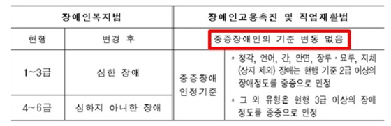 장애 등급제 폐지 이후 장애인복지법과 장애인고용촉진법상 중증장애인 기준이 다르게 적용된다.ⓒ고용노동부 에이블포토로 보기▲ 장애 등급제 폐지 이후 장애인복지법과 장애인고용촉진법상 중증장애인 기준이 다르게 적용된다.ⓒ고용노동부지난 2019년 7월 이전 1등급에서 6등급의 장애등급제가 심한 장애(구 1-3등급)와 심하지 않은 장애(구 4-6등급)의 2단계로 개편되어 유지되고 있다.