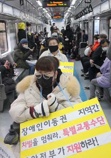 22일 “장애인 이동권 보장”을 외치며 4호선 당고개행 열차 첫 번째 칸을 점거한 전국장애인차별철폐연대 활동가들.ⓒ에이블뉴스 에이블포토로 보기▲ 22일 “장애인 이동권 보장”을 외치며 4호선 당고개행 열차 첫 번째 칸을 점거한 전국장애인차별철폐연대 활동가들.ⓒ에이블뉴스