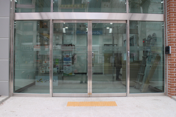 덕양구 여권민원실 주출입구 출입문은 자동문만 설치됐고, 자동문 앞바닥에 점자블록이 설치돼 있어 휠체어를 사용하는 장애인이나 시각장애인 모두 이용에 불편을 겪는다. 옆에는 시각장애인이 손끝으로 만져 건물 내부를 알 수 있는 점자안내판이 설치돼 있지 않았다. ⓒ박종태 에이블포토로 보기▲ 덕양구 여권민원실 주출입구 출입문은 자동문만 설치됐고, 자동문 앞바닥에 점자블록이 설치돼 있어 휠체어를 사용하는 장애인이나 시각장애인 모두 이용에 불편을 겪는다. 옆에는 시각장애인이 손끝으로 만져 건물 내부를 알 수 있는 점자안내판이 설치돼 있지 않았다. ⓒ박종태