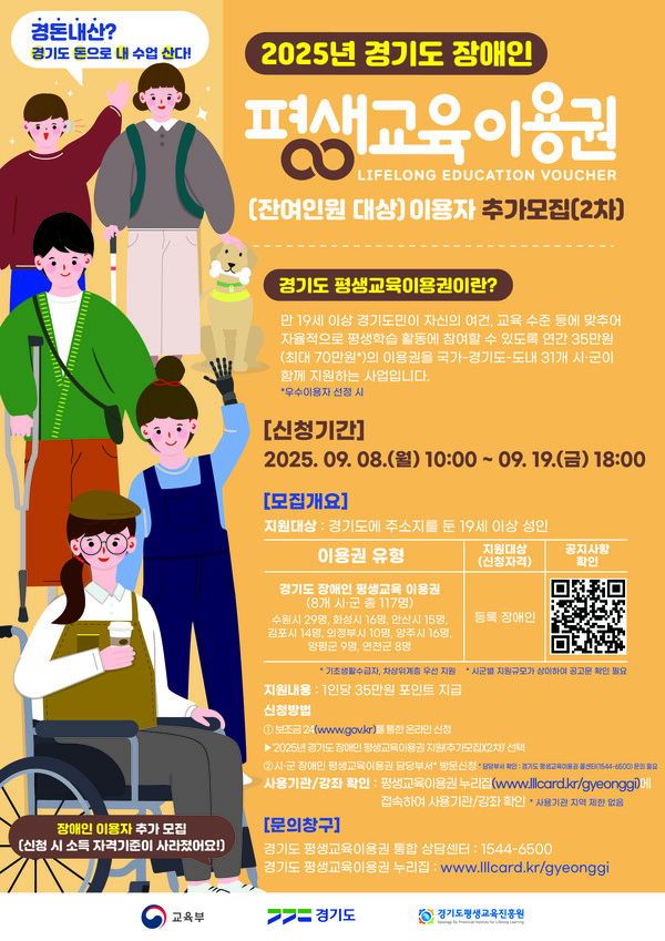 【에이블뉴스 이슬기 기자】경기도와 경기도평생교육진흥원이 오는 8일부터 19일까지 ‘2025년 장애인 평생교육이용권’ 신청자를 추가 모집한다.