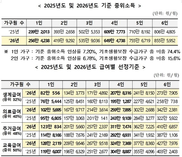 생계급여는 선정기준이 곧 최저보장수준이다. 1인 가구 기준 2025년 76만 5444원에서 2026년 82만 556원으로, 4인 가구 기준 2025년 195만 1287원에서 2026년 207만 8316원으로 인상했다.