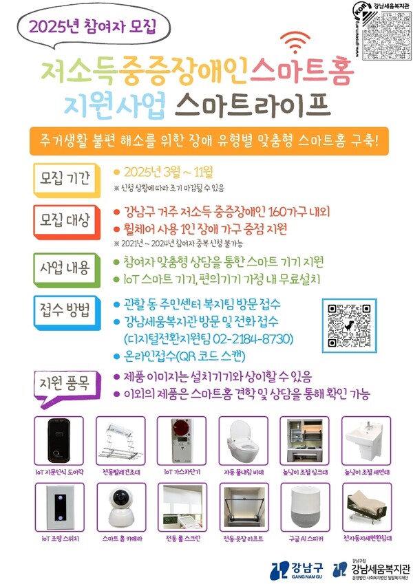 【에이블뉴스 이슬기 기자】강남구가 중증장애인을 위한 AI(인공지능)·IoT(사물인터넷) 기반의 스마트 홈 주거환경 개선 지원사업 참여자를 모집한다고 23일 밝혔다.