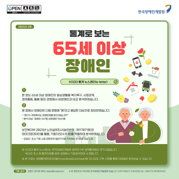 한편, 한국장애인개발원은 국내·외 통계자료를 장애 관점에서 재분석해 정책 이슈를 알리는 KODDI 통계 뉴스레터를 정기 발행하고 있다. 뉴스레터 전문은 '장애통계데이터포털(https://koddi.or.kr/stat)'에서 확인할 수 있으며, 구독 신청 시 이메일로 받아볼 수 있다.
