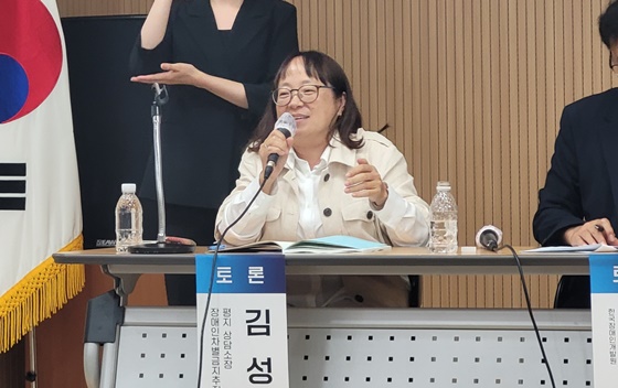 23일 오후 2시 서울 여의도 이룸센터에서 개최된 ‘발달장애인의 형사사법 과정에서의 차별시정 토론회’에서 토론하는 장애인차별금지추진연대 평지 김성연 상담소장. ©에이블뉴스
