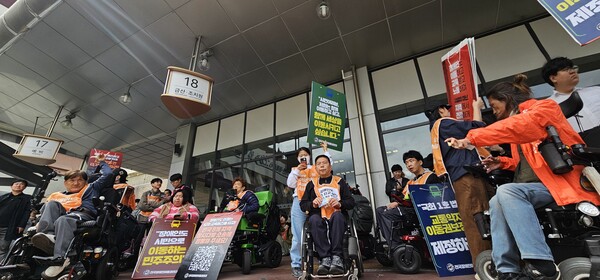전국장애인이동권연대(이하 이동권연대)가 31일 서울고속버스터미널에서 기자회견을 갖고, 전국 동시다발 시외이동권 차별 구제 소송을 선포했다.ⓒ전국장애인이동권연대