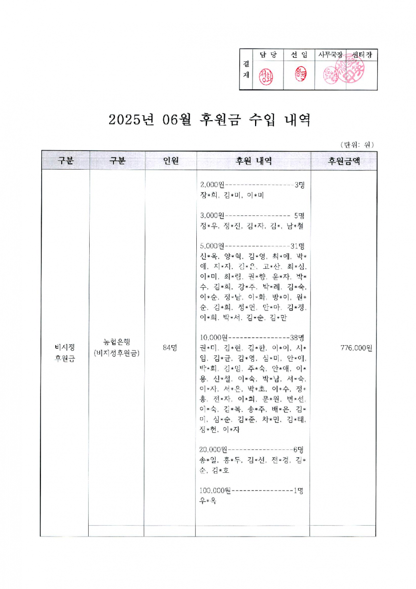 2025년 6월 후원금 수입, 사용 내역 보고 페이지 정보 작성자 햇빛촌 조회 865회 작성일 25-07-31 11:04 본문 2025년 6월 후원금 수입, 사용내역 보고 목록 이전글2025년 7월 햇빛촌 소식지 25.08.09 다음글2025년 6월 햇빛촌 소식지 25.07.09 댓글목록 댓글목록 등록된 댓글이 없습니다.
