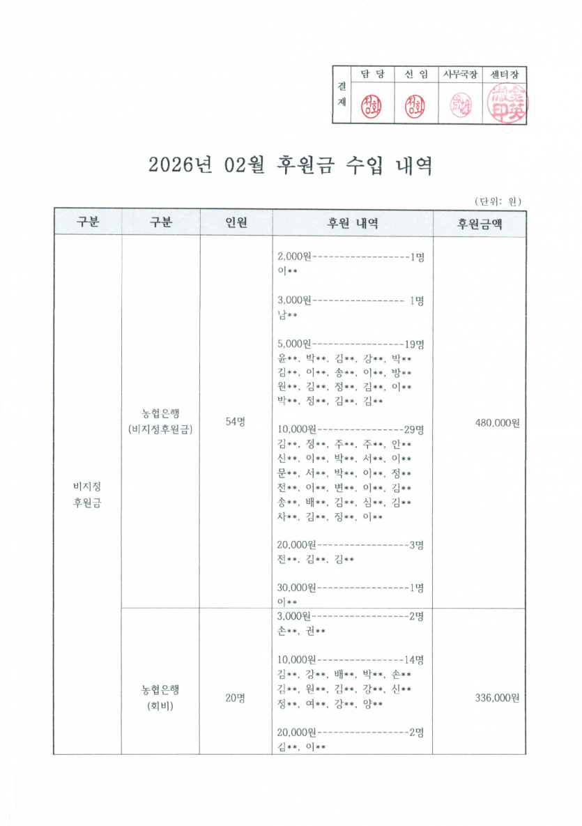 2026년 2월 후원금 수입, 사용 내역 페이지 정보 작성자 햇빛촌 조회 119회 작성일 26-03-18 16:49 본문 2026년 2월 후원금 수입, 사용 내역 목록 이전글2025 햇빛촌 결산공고 26.03.18 다음글2026년 집단동료상담 기초과정 참여자 모집 안내(마감) 26.03.18 댓글목록 댓글목록 등록된 댓글이 없습니다.