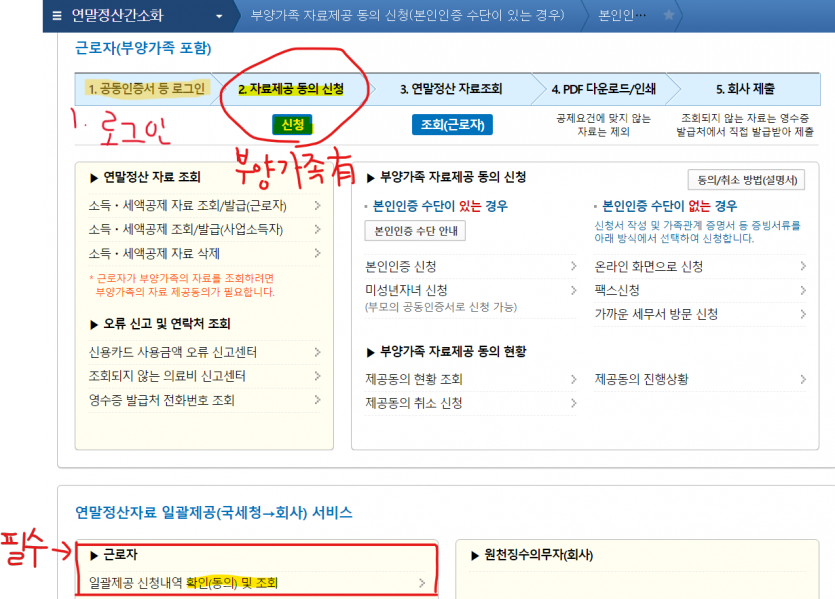 1. 홈택스 - 로그인: 공인인증서 혹은 간편로그인 - 조회/발급 선택 - 연말정산 - 연말정산간소화 선택 - 화면 중간부분에 위치한 '연말정산자료 일괄제공(국세청 -> 회사) 서비스의 [근로자 일괄제공 신청내역 확인(동의) 및 조회] 선택 - 간소화 자료를 제공받는 회사 선택 - 동의 체크 - 확인(동의)하기