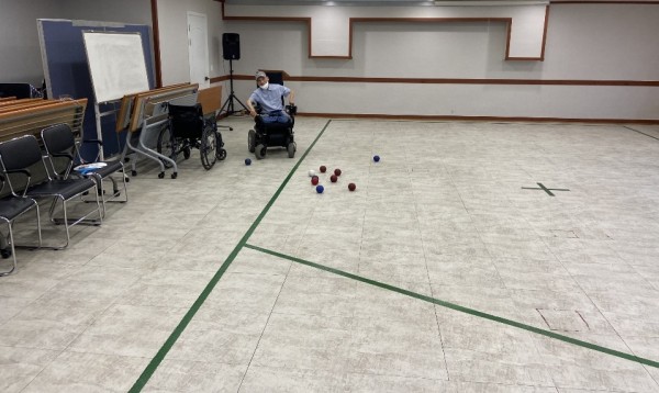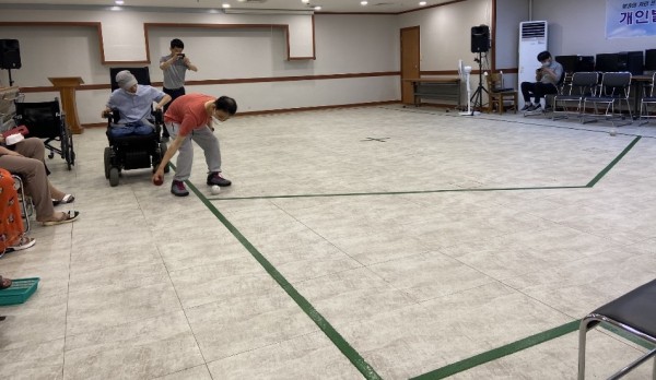 코치가 보치아를 공을 여러 군데로 각따로 두고 한 번씩 던져 보라고 가까이 붙이는 연습을 했습니다.