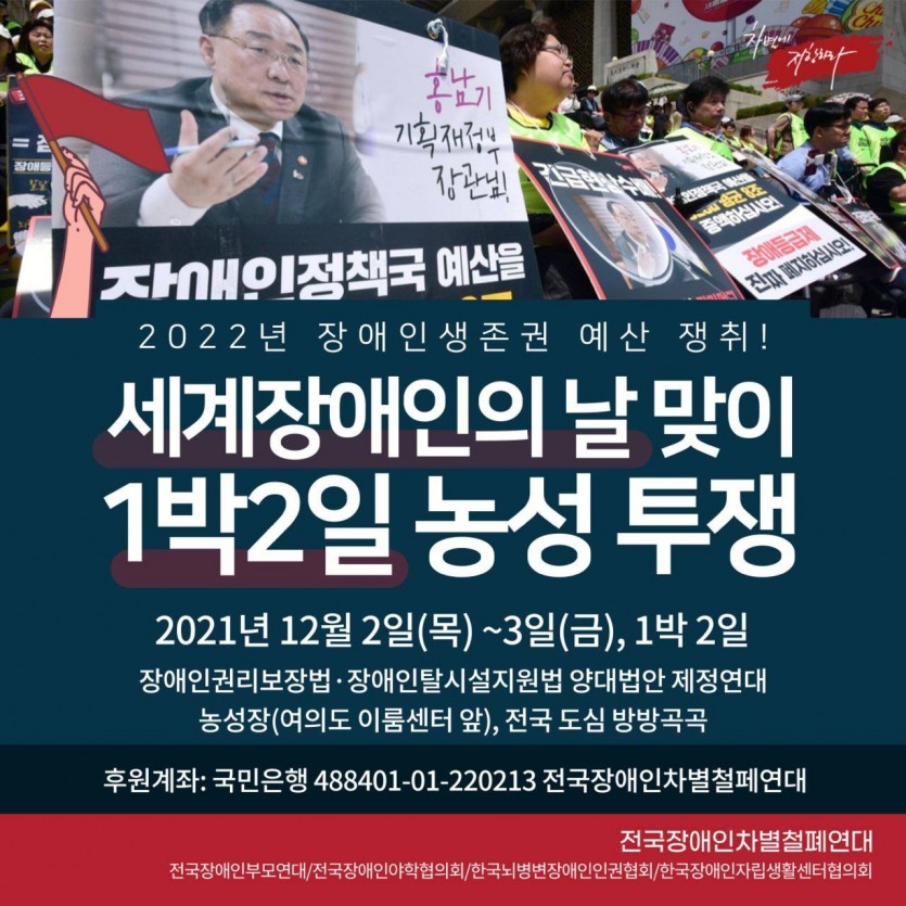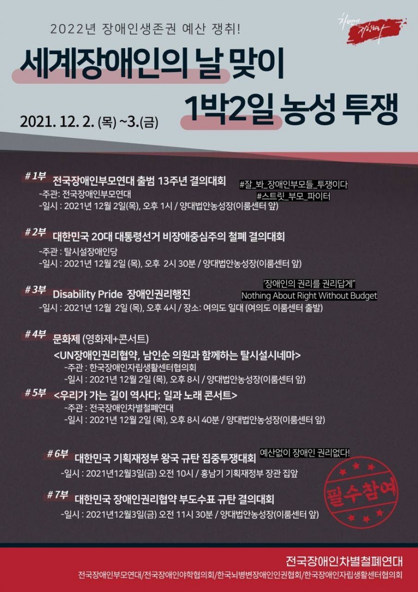 2021 12 02~03 2022년 장애인 생존권 예산 쟁취! 세계장애인의 날 맞이 1박2일 농성투쟁 페이지 정보 작성자 햇빛촌 조회 593회 작성일 22-01-17 13:18 본문 2021 12 02~03 2022년 장애인 생존권 예산 쟁취! 세계장애인의 날 맞이 1박2일 농성투쟁 목록 이전글2021 12 02~12 글쓰기 자조모임 참새방앗간 시화전 22.01.17 다음글2021 12 01 2차 동료상담가 보수교육 22.01.17