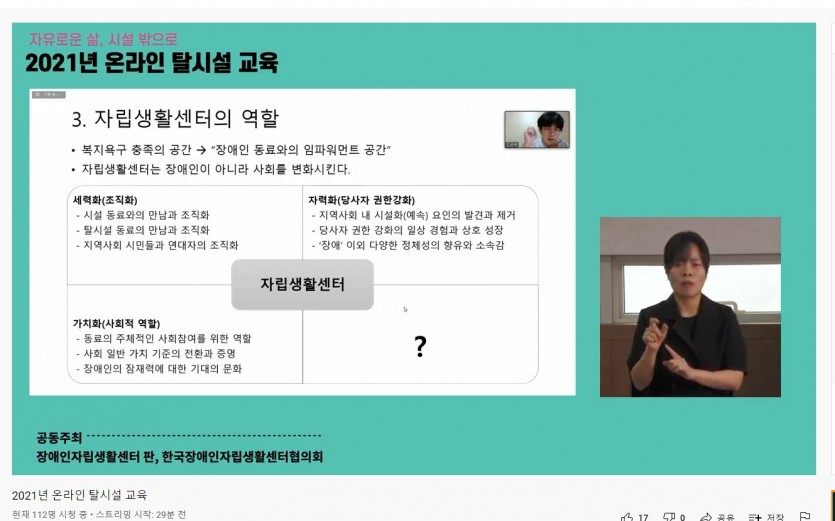 8월 25일 탈시설 정책 바로알기 교육(온라인) 페이지 정보 작성자 햇빛촌 조회 470회 작성일 21-10-28 14:21 본문 8월 25일 탈시설 정책 바로알기 교육(온라인) 목록 이전글8월 26일 행정복지센터 모니터링 (송포동행정복지센터) 21.10.28 다음글8월 24일 참새방앗간 19차 21.10.28