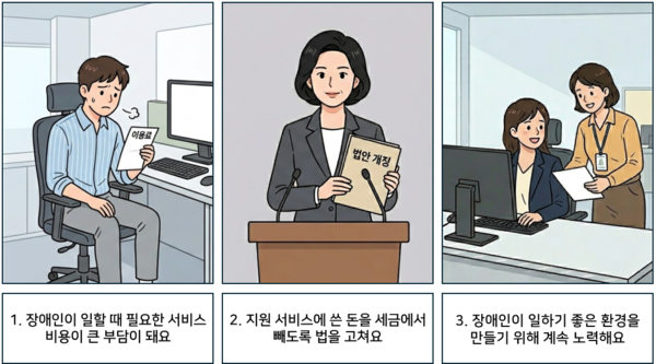 1 장애인이 일할 때 필요한 서비스 비용이 큰 부담이 돼요. 2 지원 버시스에 쓴 돈을 세금에서 빼도록 법을 고쳐요. 3 장애인이 일하기 좋은 환경을 만들기 위해 계속 노력해요. ©AI 편집실