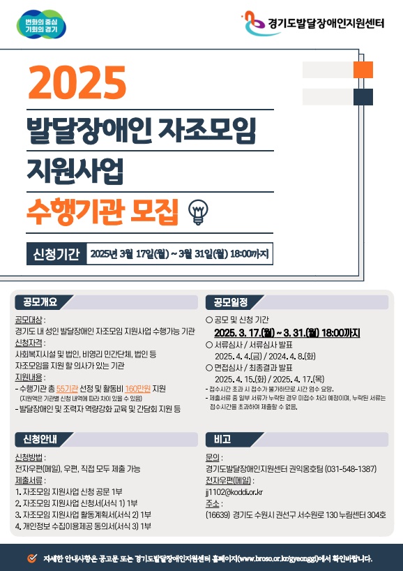 자세한 사항은 경기도발달장애인지원센터 누리집을 방문하거나 전화(031-548-1387)로 문의하면 확인할 수 있다.