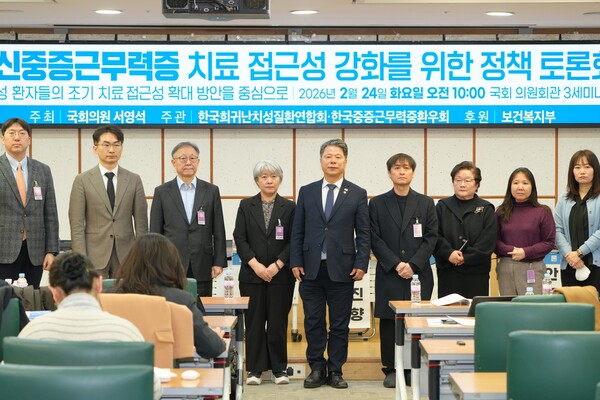 【에이블뉴스 이슬기 기자】국회 보건복지위원회 소속 서영석 의원(더불어민주당)이 주최하고 한국희귀·난치성질환연합회와 한국중증근무력증환우회가 주관한 ‘전신중증근무력증(MG) 치료 접근성 강화를 위한 정책 토론회’가 지난 24일 국회의원회관 제3세미나실에서 열렸다.