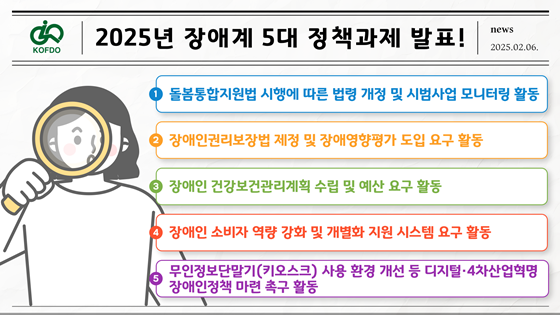 2025년 선정된 5가지 정책과제는 ▲돌봄통합지원법 시행에 따른 법령 개정 및 시범사업 모니터링 활동 ▲장애인권리보장법 제정 및 장애영향평가 도입 요구 활동 ▲장애인 건강보건관리계획 수립 및 예산 요구 활동 ▲장애인 소비자 역량 강화 및 개별화 지원 시스템 요구 활동 ▲무인정보단말기(키오스크) 사용 환경 개선 등 디지털·4차산업혁명 장애인정책 마련 촉구 활동이다.