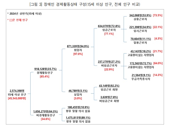 6일 한국장애인고용공단의 ‘2024년 상반기 장애인경제활동 실태조사’에 따르면, 2024년 5월 기준 우리나라 15세 이상 등록장애인은 257만4398명이다.