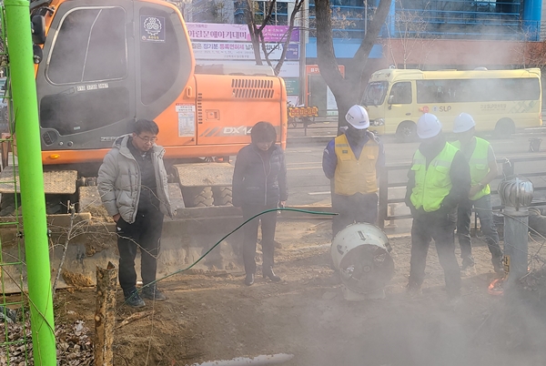 이날 현장을 방문한 지역구 시의원인 김미경 건설교통위원장은 “단지 기계실에서 누수가 발생해 원인을 찾던 중 난방을 제공하는 열수송관에 문제가 있는 것으로 파악되어 지역난방공사에서 지원에 나선 것”이라며 “강추위가 지속되고 있어 금일중으로 작업을 완료해 난방 공급에 차질이 없도록 할 계획인 것으로 파악된다”고 밝히면서 설 연휴에도 불구하고 작업에 여념 없는 현장 관계자들을 격려했다.