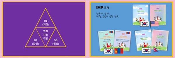 2월부터 매주 토요일 10시부터 12시까지 서울시 광진구 소재 재한몽골학교에서 개설·운영되는 IMP 글로벌스쿨은 발달장애인, 경계선 지능인 등 느린 학습자, 이중언어로 의사소통에 제한이 있는 다문화가족에게 영성지능계발, 전인적 삶의 로드맵을 제시할 예정이다.