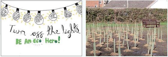 예를 들어 학생들은 학교 텃밭 가꾸기 및 화단 조성을 통해 지속 가능한 생활을 실천하기도 하고 재활용을 촉진하기 위해 분리수거에 적극 동참하고 분리수거 수거에 관여하며 에너지 사용을 줄이기 캠페인을 통해 학교 학생들이 환경 보호의 중요성을 인식하도록 한다.