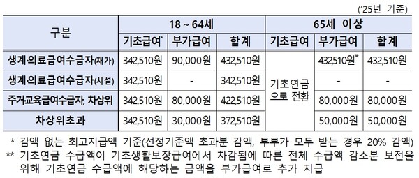 한편, 복지부는 저소득 장애인의 생활 안정을 위해 2025년 급여액 기준으로 18세 이상 중증장애인 대상으로는 월 최대 43만 2,510원의 장애인연금을, 18세 이상 경증장애인 대상으로는 월 6만 원의 장애수당을 지급하고 있다.
