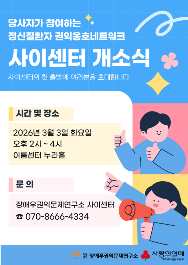 【에이블뉴스 이슬기 기자】장애우권익문제연구소(이하 연구소)가 사회복지공동모금회의 지원으로 ‘당사자가 참여하는 정신질환자 권익옹호 사업’을 수행하기 위해 오는 3월 3일 오후 2시 서울 영등포구 이룸센터 누리홀에서 '당사자가 참여하는 정신질환자 권익옹호네트워크 사이센터(이하 사이센터)' 개소식을 개최한다.