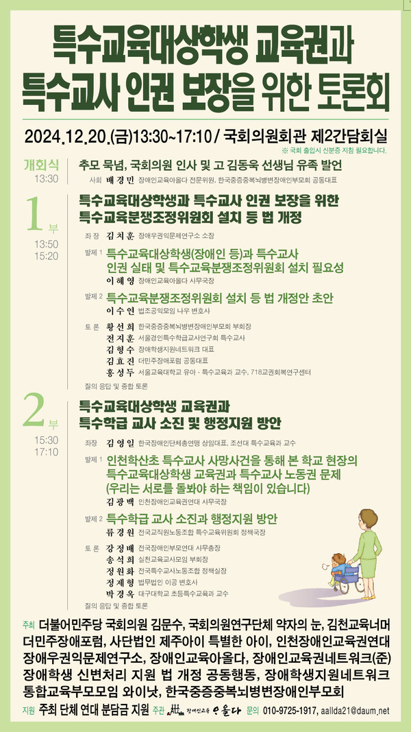 제 2부 ‘특수교육대상학생 교육권과 특수학급 특수교사 소진 문제 및 행정지원 방안 토론’은 김영일 좌장(장애인단체총연맹 상임대표, 조선대 특수교육과 교수)의 주재로 김광백 인천장애인교육권대 사무국장이 인천 학산초 특수교사 사망사건을 통해 본 특수교육대상학생 교육권과 특수교사 노동권 문제를 발표한다.
