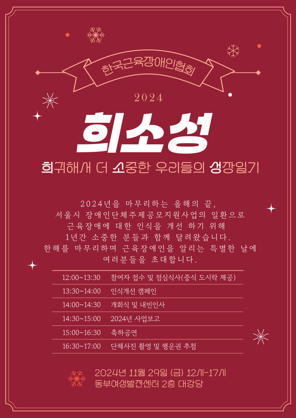 또한 신경근육계 장애인에 대한 홍보에 앞장서는 하모니카팀 공연과 근육장애인의 소망이 담긴 비행기 날리기, 소원 트리, 행운권 추첨, 축하공연 등이 많은 프로그램 진행될 예정이다.